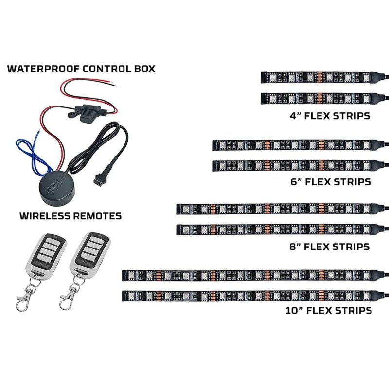 LEDGlow 8pc Advanced Million Color SMD LED ATV Kit Adds Custom & Stylish Aftermarket Multi-Color Accent Lighting to Your Quad When Hitting the Trails. Control Box Features 15 Solid Color Modes, 3 Flashing Modes, 2 Color Cycle Modes & 1 Fading Mode - Round, Waterproof Design That's Easy to Hide Under the Seat - 12" of Power, Ground & Brake Light Wires with a Waterproof 2-Amp Inline Blade Fuse - Solid Colors: Blue, Red, Green, Pink, Purple, Teal, Orange, Aqua, Yellow, Light Pink, Light Green, Light Purple, Cool Blue, Cool White & Warm White - Automatic Brake Light Feature Illuminates the Entire ATV with Red LEDs in Unison with the Brake Lights. Includes (2) 4", (2) 6", (2) 8" & (2) 10" Flexible Lighting Strips that House 84 SMD LEDs, Waterproof Control Box, 2 Wireless Remotes, Light Strip Power Harness, 3' of Wire per Strip & Zip Ties. Detailed Instructions to Walk Users Through the Installation Process Step-by-Step.Other fine products