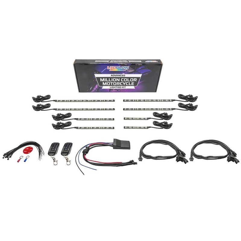 LEDGlow 8pc Bluetooth Advanced Million Color SMD LED Motorcycle Kit Combines Your Smartphone Device with Ultra-Bright Multi-Color Accent Lighting that Transforms the Look & Style of Your Motorcycle with a Few Simple Swipes. LEDGlow Motorcycle Control App Features a Color Wheel to Select Any Solid Color - 10 Unique Lighting Modes - 5 Presets to Save Your Favroite Colors/Patterns - Dual Zone Control for Customized Colors/Patterns in 2 Sections of the Motorcycle - Automatic Brake Lights Feature Illuminates the Entire Bike with Red LEDs in Unison with the Brake Lights - Hazard Lights Feature - Low Voltage Shut Off - Available on iOS & Android. Includes (2) 4", (2) 6", (2) 8" & (2) 10" Flexible Lighting Strips that House 84 SMD LEDs, Bluetooth Control Box, 2 Wireless Remotes, Motorcycle Strip Power Harness, 3' of Wire per Strip, Zip Ties & a Detailed Installation Guide that Walks You Through the Process of Installing the Kit & Pairing Your Smartphone Device to the Bluetooth Control Box. Control Box Features Bluetooth 4.0 LE Chip that Seamlessly Connects to Smartphone - Waterproof Design - Compact & Easy to Hide Under the Seat - Ability to Use Kit with Smartphone or Wireless Remotes.Other fine products