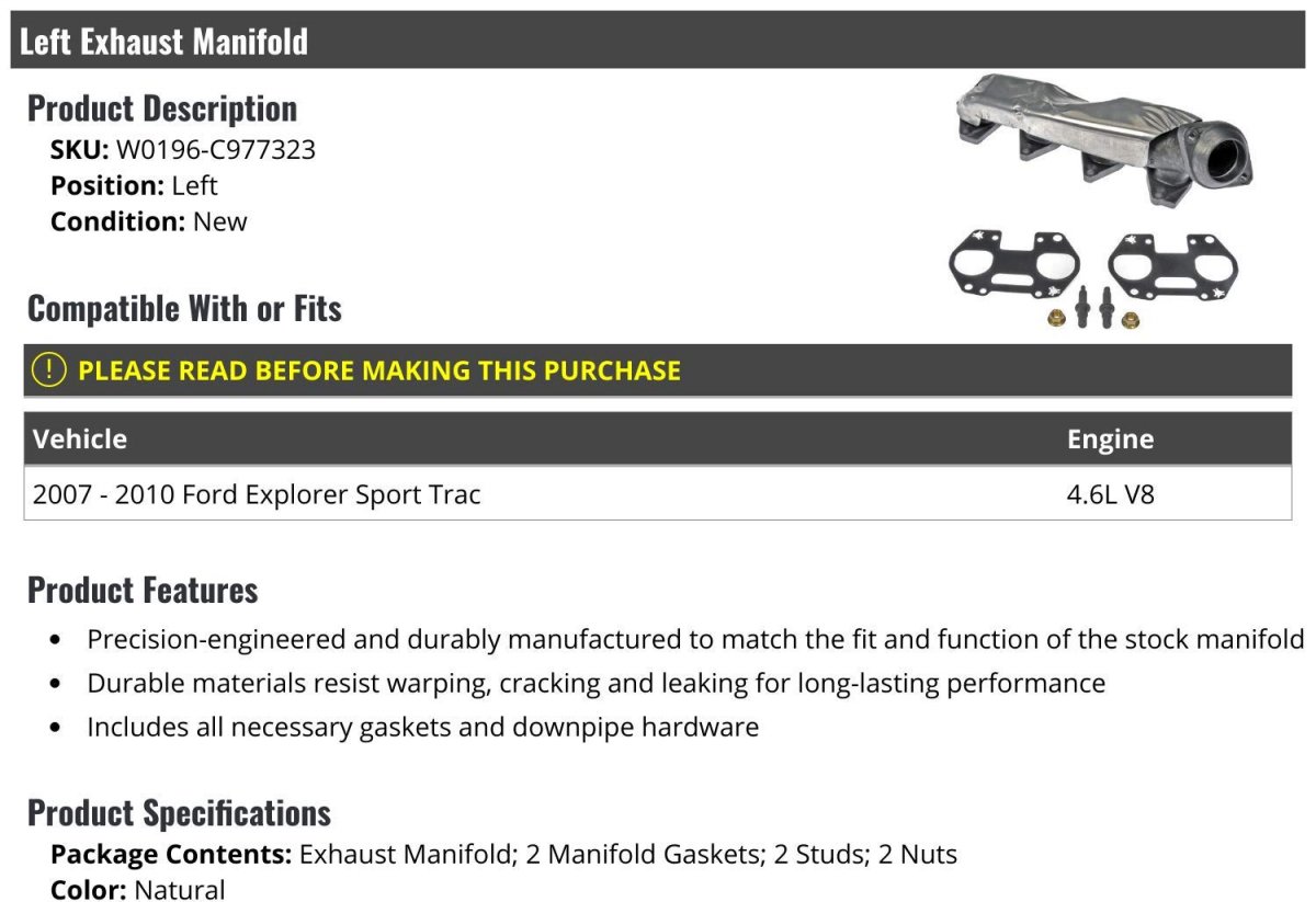 Compatible with or fits: 2007 - 2010 Ford Explorer Sport Trac 4.6L V8. Precision-engineered and durably manufactured to match the fit and function of the stock manifold. Durable materials resist warping, cracking and leaking for long-lasting performance. Includes all necessary gaskets and downpipe hardware. Package Contents: Exhaust Manifold; 2 Manifold Gaskets; 2 Studs; 2 Nuts; Color: Natural; Grade Type: Regular.Other fine products