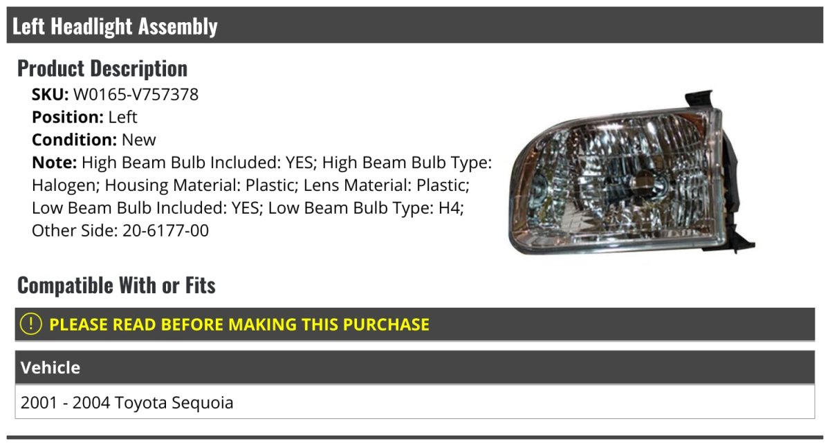 High Beam Bulb Included: YES; High Beam Bulb Type: Halogen; Housing Material: Plastic; Lens Material: Plastic; Low Beam Bulb Included: YES; Low Beam Bulb Type: H4. Compatible with or fits: 2001 - 2004 Toyota Sequoia. Left Headlight Assembly. Review Description to Ensure Proper Fit.Other fine products