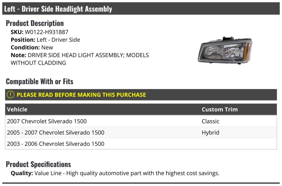 DRIVER SIDE HEAD LIGHT ASSEMBLY; MODELS WITHOUT CLADDING. Compatible with or fits: 2007 Chevy Silverado 1500 Classic. Compatible with or fits: 2005 - 2007 Chevy Silverado 1500 Hybrid. Compatible with or fits: 2003 - 2006 Chevy Silverado 1500. Review Description to Ensure Proper Fit.Other fine products
