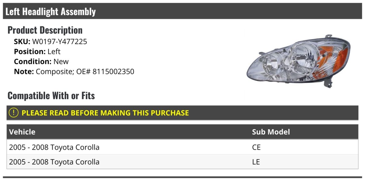 - Left Driver Side Headlight Assembly For 2005-2008 Toyota Corolla Ce Le