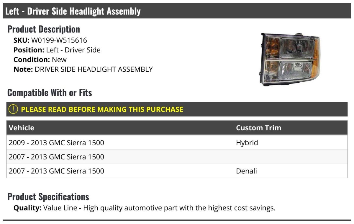 DRIVER SIDE HEADLIGHT ASSEMBLY. Compatible with or fits: 2009 - 2013 GMC Sierra 1500 Hybrid 2007 - 2013 GMC Sierra 1500 2007 - 2013 GMC Sierra 1500 Denali. Quality: Value Line - automotive part with the highest cost savings.. Left - Driver Side Headlight Assembly. Review Description to Ensure Proper Fit.Other fine products