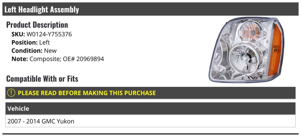 - Left Driver Side Headlight Assembly For 2007-2014 Gmc Yukon