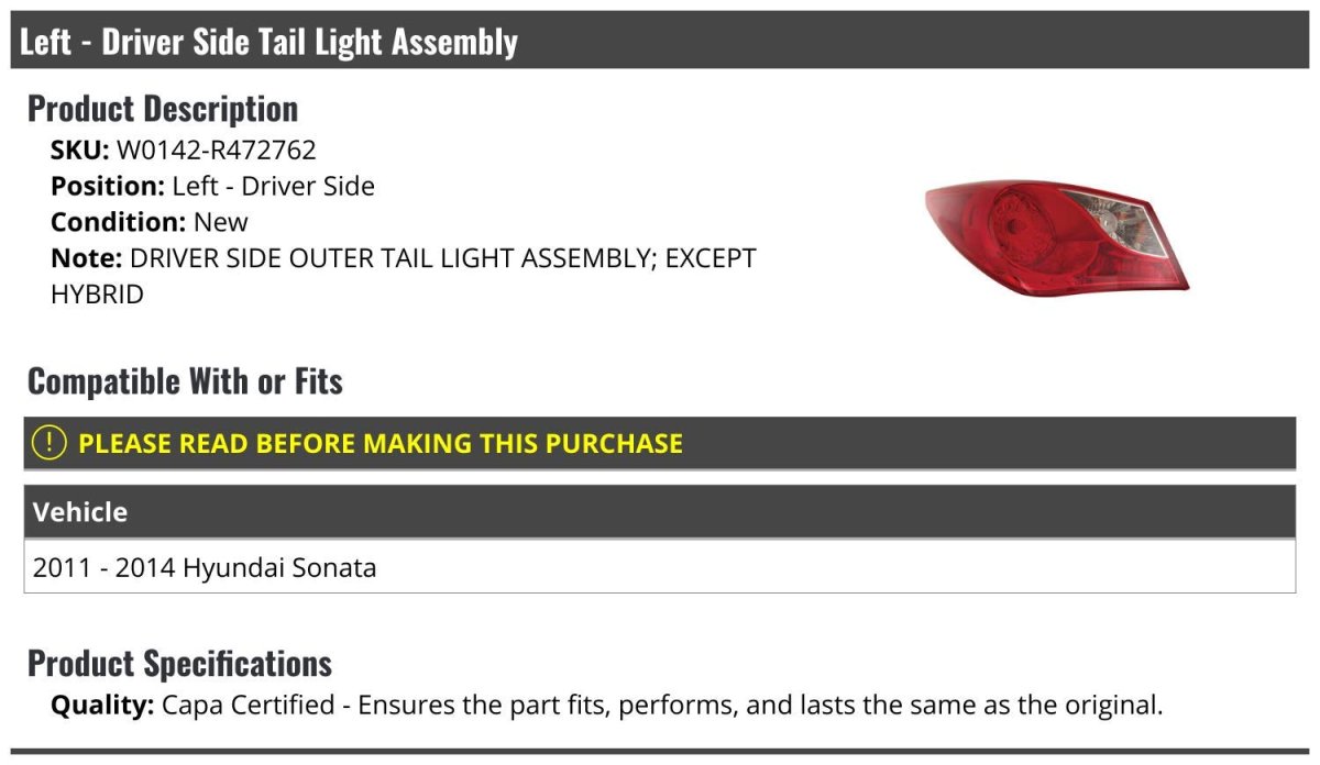- Left Driver Side Outer Tail Light Assembly For 2011 2014 Hyundai Sonata Excludes Hybrid Models