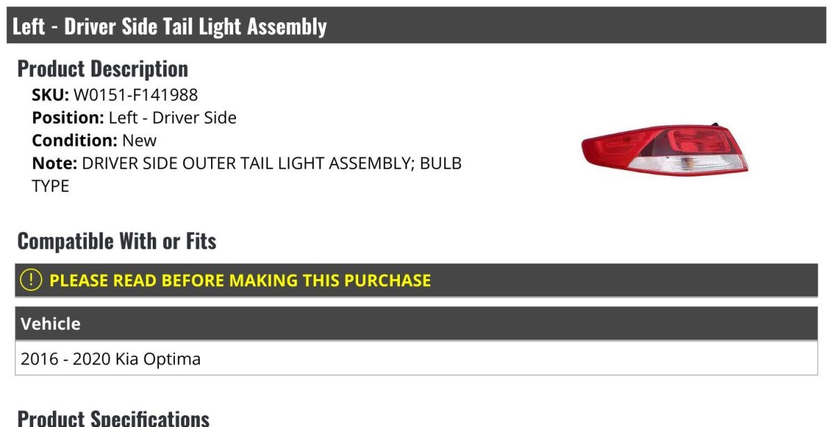 DRIVER SIDE OUTER TAIL LIGHT ASSEMBLY; BULB TYPE. Compatible with or fits: 2016 - 2020 Kia Optima. Quality: Capa Certified - Ensures the part fits, performs, and lasts the same as the original.. Left - Driver Side Tail Light Assembly. Review Description to Ensure Proper Fit.Other fine products