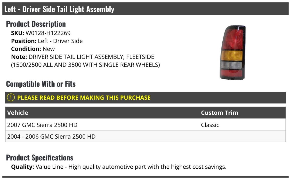 - Left Driver Side Tail Light Assembly For 2004-2007 Gmc Sierra 2500 Hd Fleetside