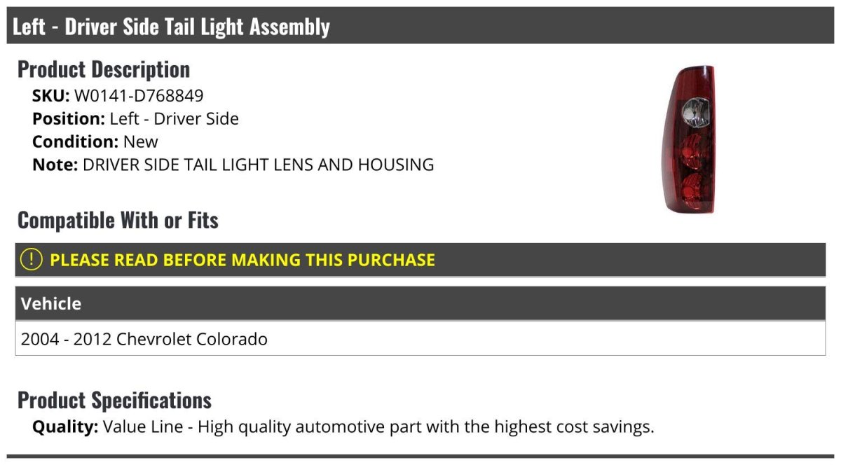 - Left Driver Side Tail Light Assembly For 2004-2012 Chevy Colorado