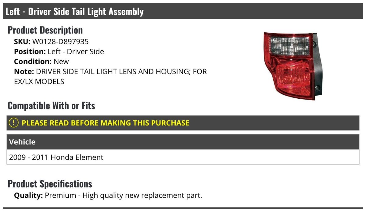- Left Driver Side Tail Light Assembly For 2009-2011 Honda Element Ex Lx