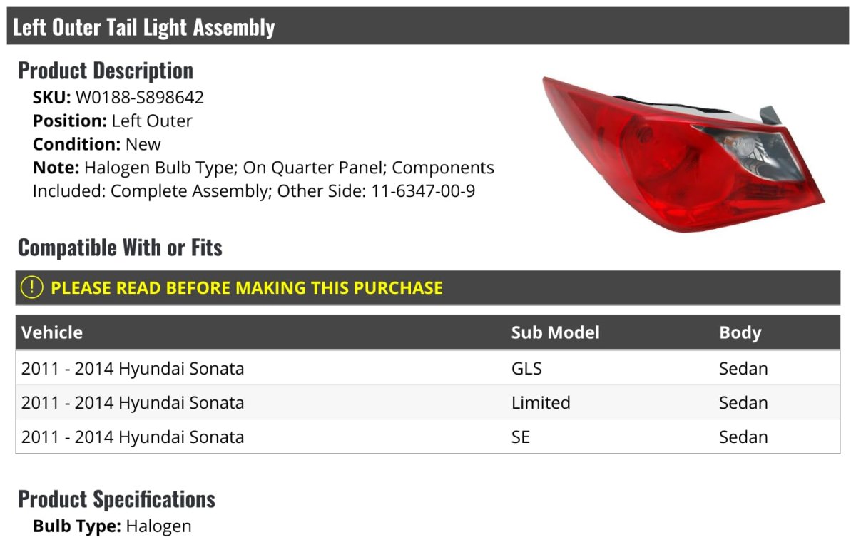 Bulb Type: Halogen; Lens Color: Red, Clear; On Quarter Panel; Components Included: Complete Assembly. Compatible with or fits: 2011 - 2014 Hyundai Sonata GLS Sedan. Compatible with or fits: 2011 - 2014 Hyundai Sonata Limited Sedan. Compatible with or fits: 2011 - 2014 Hyundai Sonata SE Sedan. Review Description to Ensure Proper Fit - Left Outer Tail Light Assembly.Other fine products