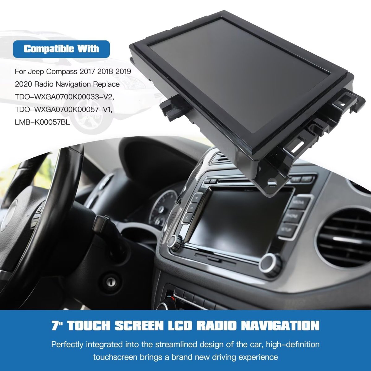 Replacement Part Number: TDO-WXGA0700K00033-V2, TDO-WXGA0700K00057-V1, LMB-K00057BL. Compatibility: Fit for Jeep Compass 2017 2018 2019 2020. Features: Built to strict quality control standards. High light transmittance and superior visibility, With high touch precision, With LCD display, with high resolution and precise touch performance.Other fine products