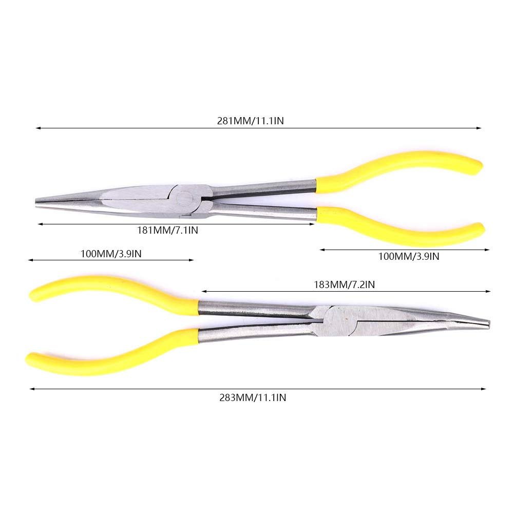 Sturdy Construction ------ Long Nose Pliers are made of carbon steel,ensuring durability and resistance to wear during extensive use.. Ultra- Cutting ------ The specially quenched cutting provides exceptional sharpness,effortlessly handling intricate tasks and materials.. Ergonomic Non-Slip Handle ------ Long Nose Pliers feature a comfortable grip design,reducing hand fatigue and enhancing control during operation.. Versatile Design ------ This set includes 2 different shapes of pliers,tailored to meet diverse needs for detailed work in tight spaces.. Portable and Compact ------ Lightweight at approximately 11 inches in length,this hand tool is easy to carry,making it a must-have for any toolbox..Other fine products