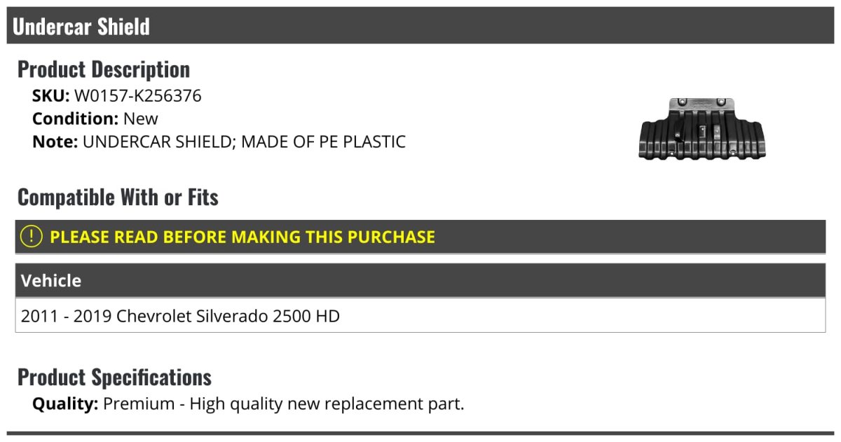 Lower Engine Cover Undercar Shield. Compatible with or fits: 2011 - 2019 Chevy Silverado 2500 HD. Quality: Premium - new replacement part.. Undercar Shield. Review Description to Ensure Proper Fit.