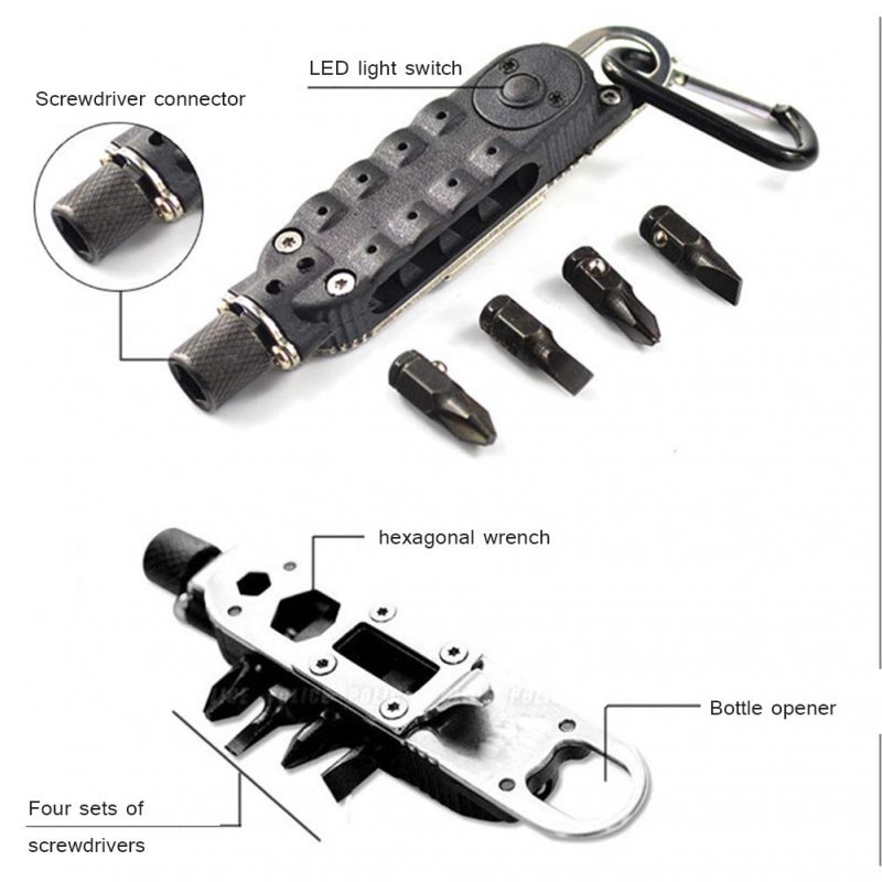 Perfect design: this line for camping, outdoors, survival, fishing, hunting, driving, exploring travel, simple household means.. Material: Made of stainless steel material. Compact, durable, prevents rust and stains. All small tools could be easily folded without taking up much space.. Multifunctional: multi-function screwdriver carry carabiner with LED flashlight, flat and phillips hex bit carrier.. EDC keychain screwdriver: an ideal gift for dad, husband, students on Christmas, anniversary, birthday, etc..Other fine products