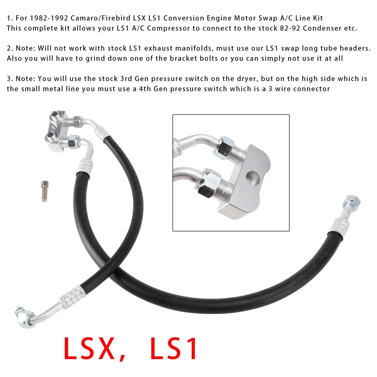 This product fit for Camaro / For Firebird LSX LS1 Conversion Engine Motor Swap A/C Line Kit. Stable performance, high reliability, suitable for replacing your broken one.. According to the original factory specifications, perfect match for the original car.. Aftermarket product with premium quality..Other fine products