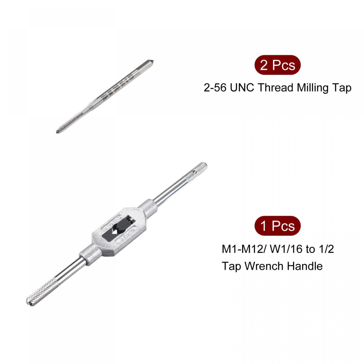 Size: 2 x Machine Tap (Thread Size: #2-56 UNC; Shank Side Width: 2.2mm / 0.1 inch; Thread Length: 12mm / 0.47 inch;Total Length: 46mm / 1.8 inch),1 X Tap Wrench Handle (Fit tap size: M1-M12 (Mertic)/ 1/16" - 1/2"(UNC/UNF) / 1.5mm-10mm). Applications: Suitable for drilling, tapping, cutting on soft metal, aluminum plate, iron,also can be used with drills, reamers, screw extractors and other small tools that need to be rotated manually.. Features: Tap wrench has 1 rigid handle and 1 adjustable handle that adjusts the jaws to clamp tools easily and firmly. Straight tap wrench provides great leverage, and is specially designed for larger-diameter taps. Easy To Use: Operates with both hands to rotate the tap wrench in a certain direction to process, repair and clean the internal thread. Tips: The force of both hands must be even when operating the tap wrench. The wrench and the tap should form an angle of 90 degrees, and the tap and the threaded bottom hole are perpendicular to each other.Other fine products