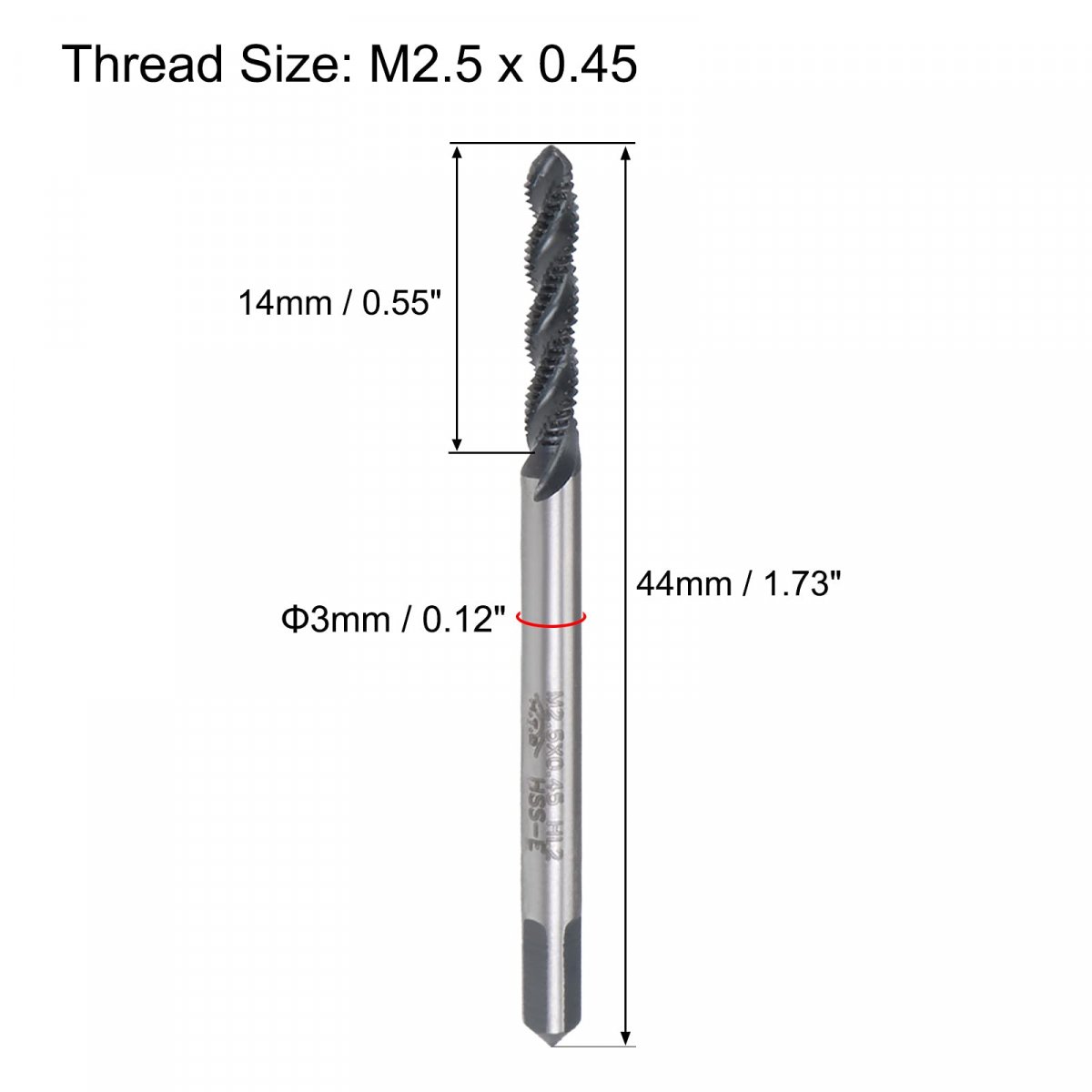 Tap Size: M2.5 x 0.45 thread, H2 tolerance. Spiral flute design, upward chip removal. Right hand thread cutting, clear threads without burrs, fast tapping with accuracy.. Material and Finish: High-speed steel tool is with high hardness and toughness for wear resistance, good for general purpose applications. Features nitriding coated surface for rust prevention and long service life.. Applications: Suitable for processing blind holes and sticky materials. Great for drilling and tapping aluminum, die steel, stainless steel, bronze, hard plastics, etc.. Easy to Use: Used on drilling machines, tapping machines, CNC and milling machines. Use with tapping oil to get higher quality threads and more durable taps.. Tips: Machine taps are suggested to be used with tap collets with overload protection. Hand use is easy to cause damage to the tap due to uneven force..Other fine products