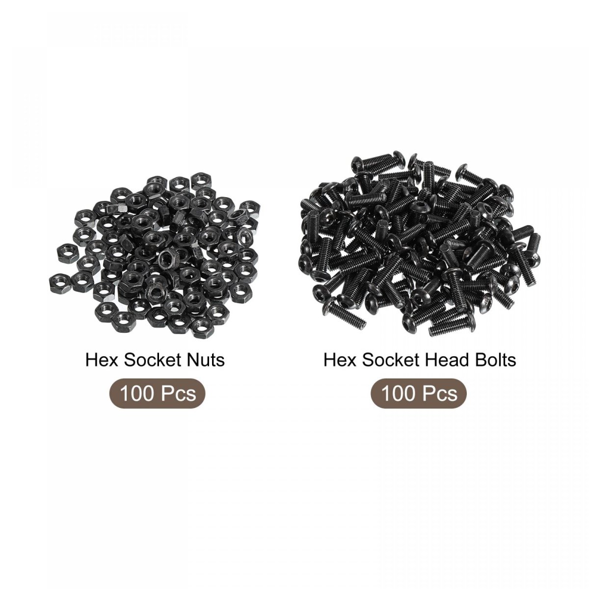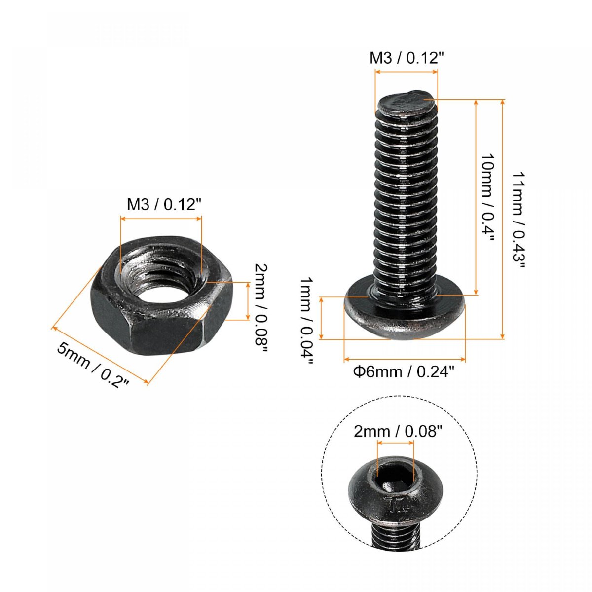 100pcs Bolt Thread Size: M3x10mm/0.12"x0.4"(D*L); Thread Pitch: 0.5mm; Total Length: 11mm/0.43"; Head Diameter: 6mm/0.24"; Hex Socket Width: 2mm/0.08"; Head Height(Approx): 1mm/0.04". 100pcs Nut Thread Size: M3/0.12"; Height: 2mm/0.08"; Hex Size: 5mm/0.2"(Hex.Width). Material: Alloy steel bolts and carbon steel nuts, high strength and have good corrosion resistance.. Application: It is widely used in the assembly and maintenance of households, machine tools, construction, ships and DIY project. Such as the assembly and fixing of guardrails, home appliances, pipeline installations, equipment, steel-framed houses, etc.. Installation: A wrench is required for installation. Generally, with a hex nut and a washer to form a fastener device(Washers are not in the package)..Other fine products