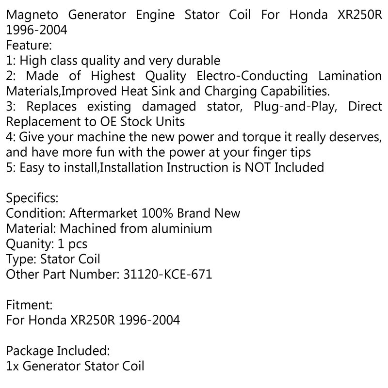 - Magneto Stator Coil Motorcycle Regulator Generator Fits For Honda Xr250 Xr250r 1996-2004 31120-kce-671