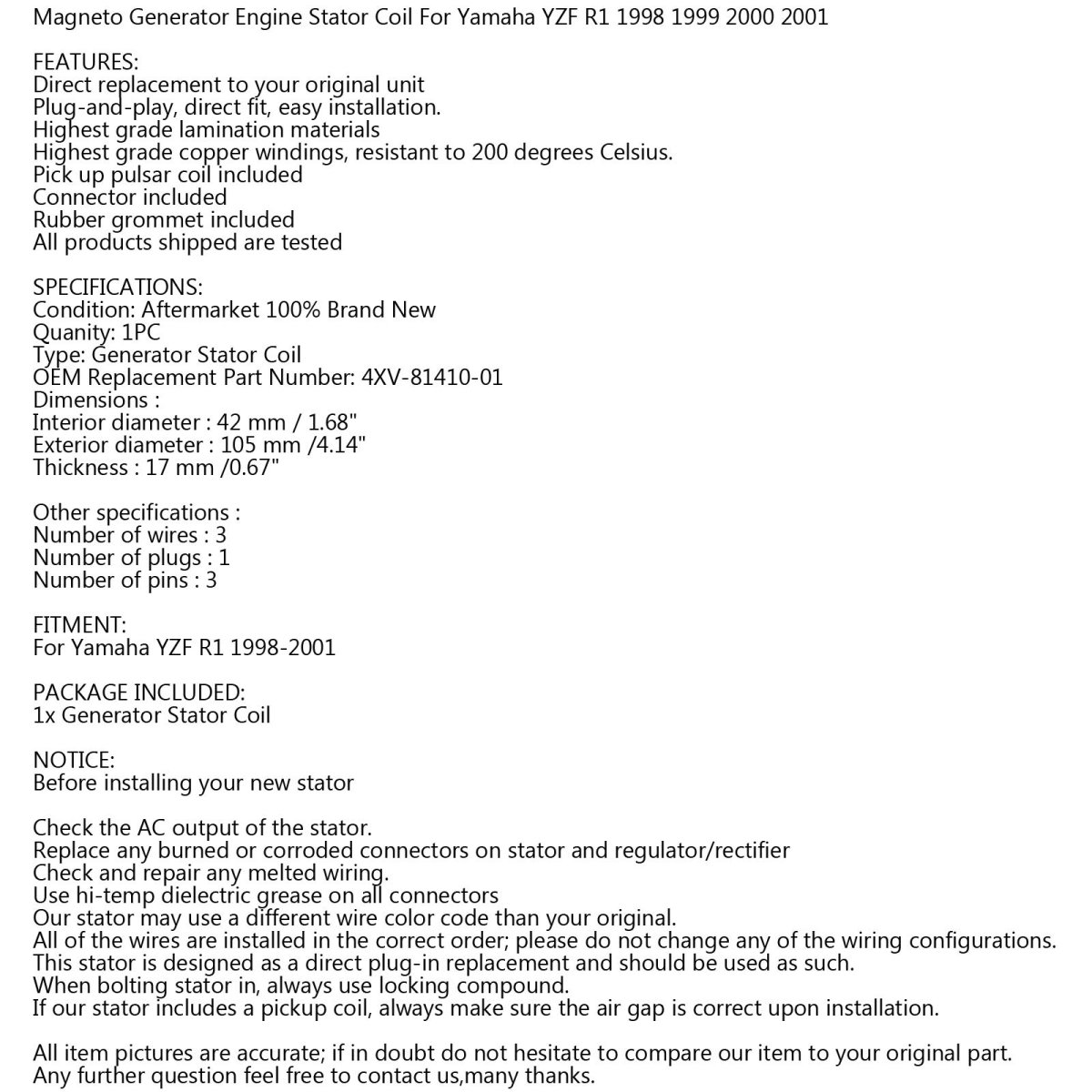 This Magneto Stator Coil is suitable for Yamaha YZF R1 1998-2001 4XV-81410-01.. MaterialMade of metal and plastic. It is durable to use.. Condition . Direct replacement to your original unit. Plug-and-play, direct fit, easy installation..