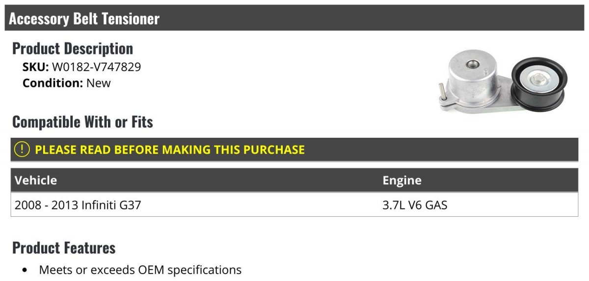 - Marketplace Auto Parts Accessory Serpentine Belt Tensioner Compatible With 2008-2013 Infiniti G37 3 7l V6 Gas