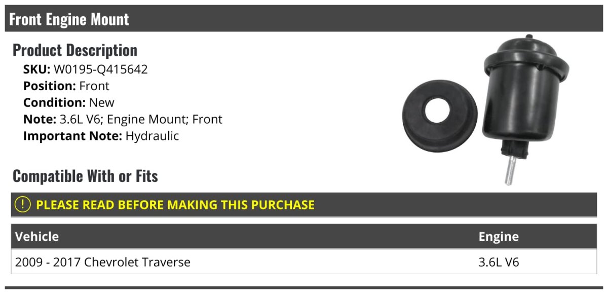 - Front Engine Mount For 2009-2017 Chevy Traverse 3 6l V6