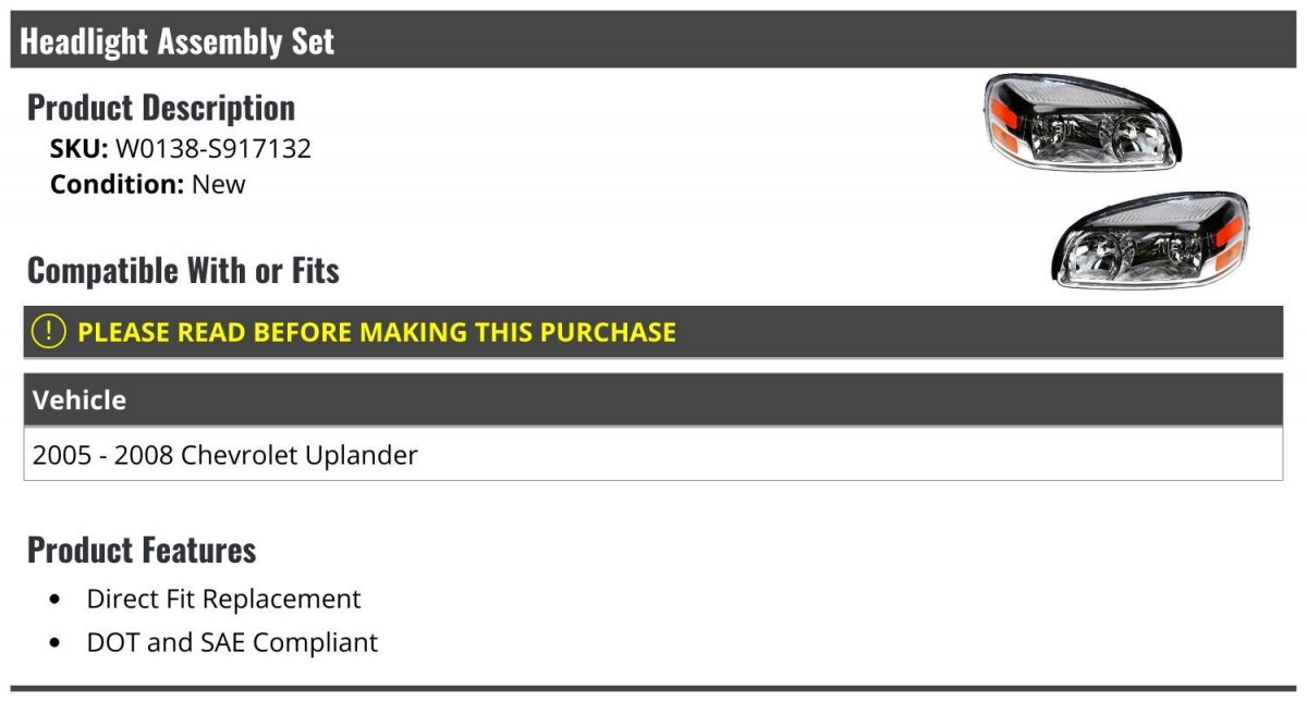 - Marketplace Auto Parts Headlight Assembly Set Of 2 Compatible With 2005-2008 Chevy Uplander