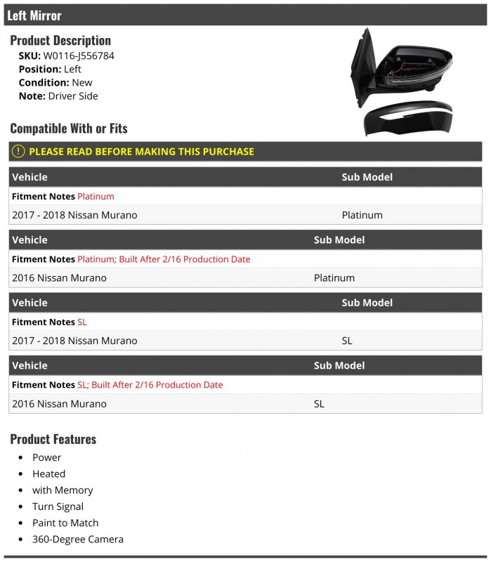 Driver Side. Compatible with or fits: (Note: Platinum) 2017 - 2018 Nissan Murano Platinum. Compatible with or fits: (Note: Platinum) 2016 Nissan Murano Platinum - From 02/2016 Vehicle Production. Compatible with or fits: (Note: SL) 2017 - 2018 Nissan Murano SL. Compatible with or fits: (Note: SL) 2016 Nissan Murano SL - From 02/2016 Vehicle Production.Other fine products