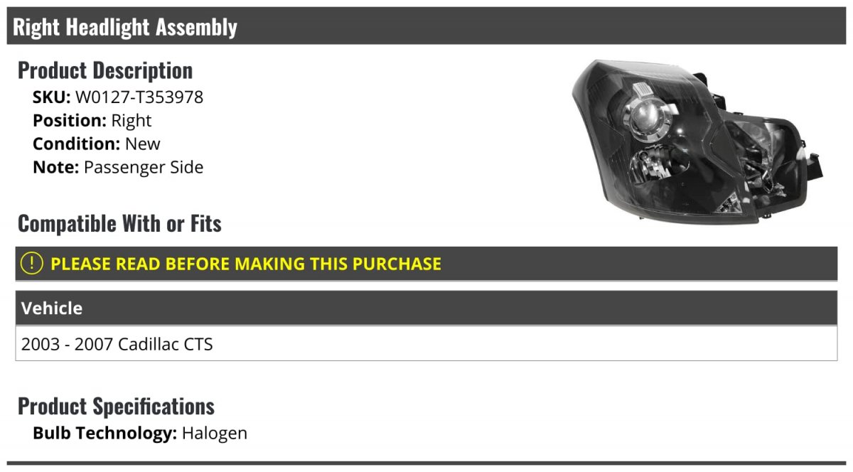 - Marketplace Auto Parts Right Passenger Side Halogen Headlight Assembly Compatible With 2003-2007 Cadillac Cts