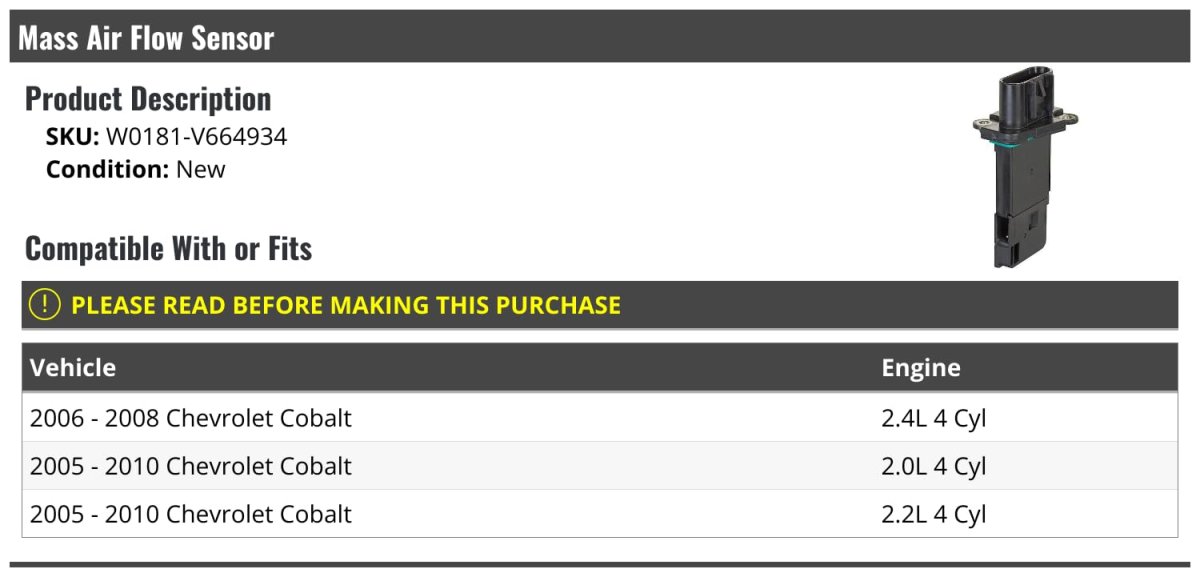 - Mass Air Flow Maf Sensor For 2005-2010 Chevy Cobalt