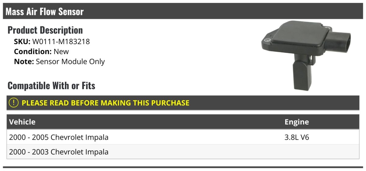 - Mass Air Flow Sensor Compatible With 2000-2005 Chevy Impala 3 8l V6