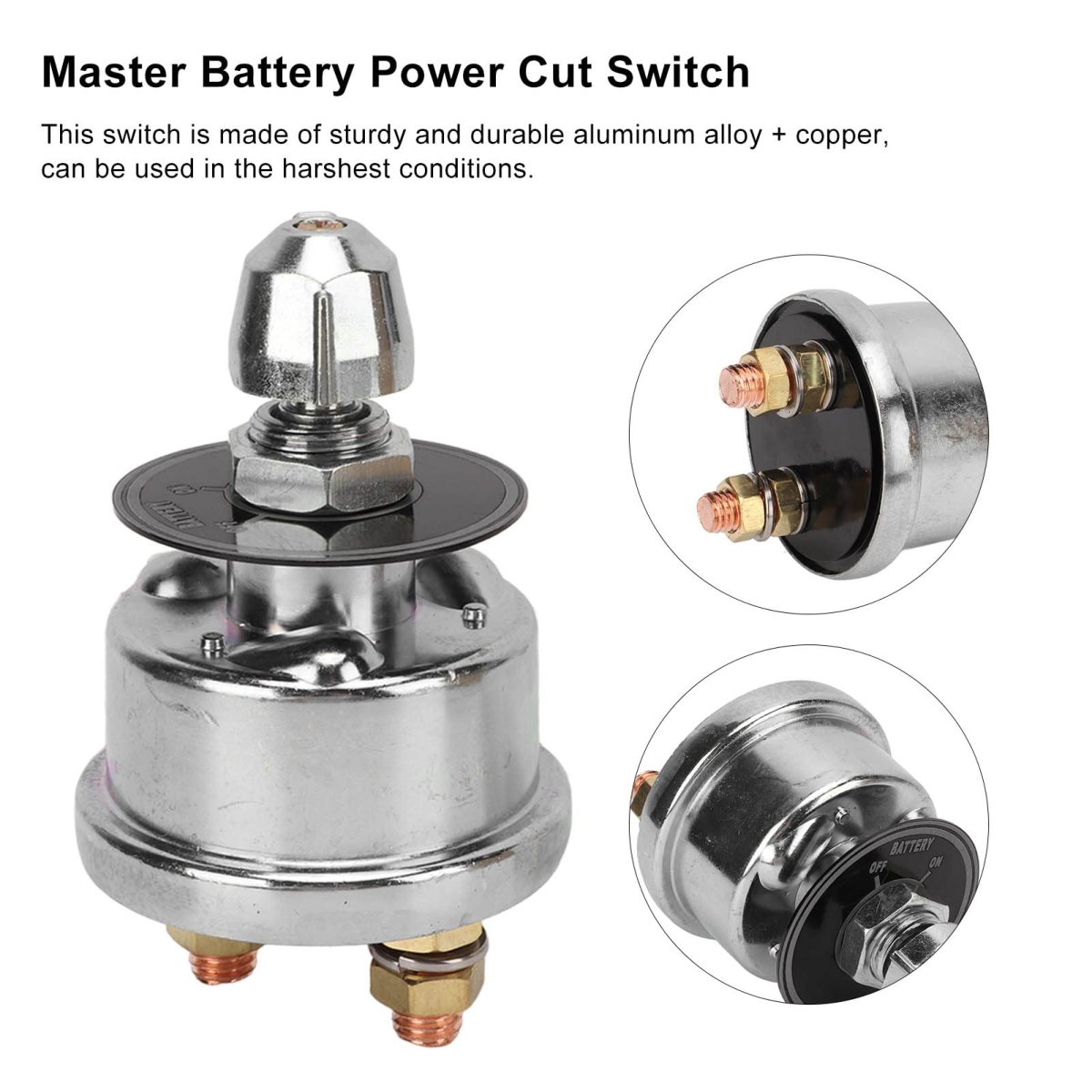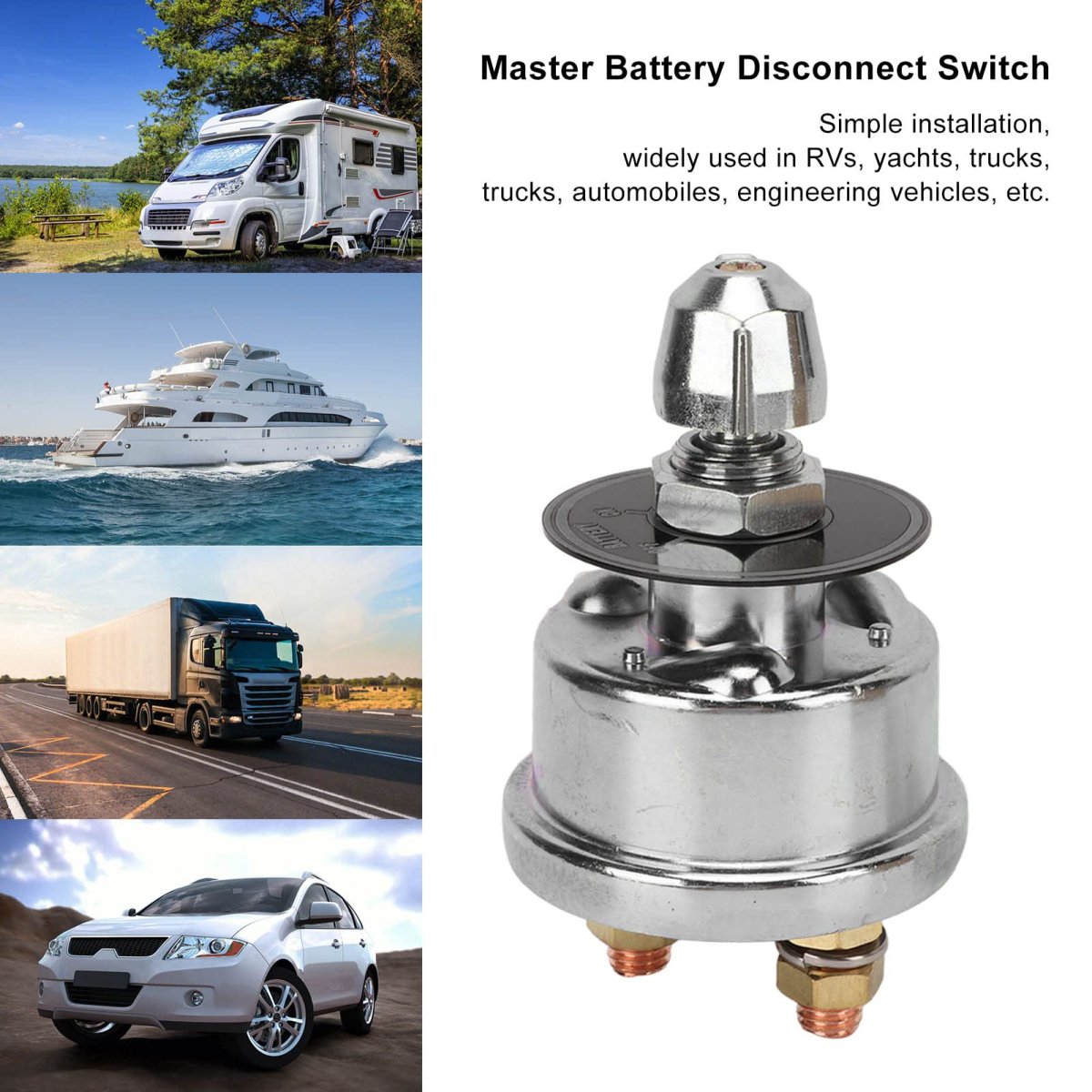 [Easy Installation] Suitable for various vehicles such as rvs, yachts, and trucks for effortless setup.. [Complete Battery Isolation] Ensures safety by eliminating power drain when the vehicle is not in use.. [Leakage Protection] Safely disconnects the battery to protect the power supply.. [Material] Crafted from sturdy aluminum alloy + copper, ensuring longevity even in harsh conditions.. [Professional Recommended] Works effectively as a power disconnect for rvs, ideal for professional installation..