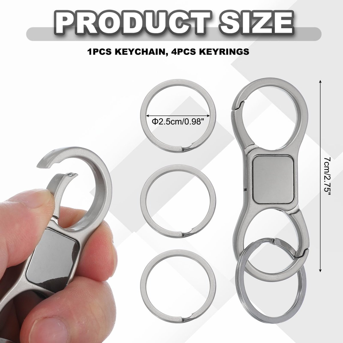 PACKAGE CONTENT: This keychain comes with 1pcs key chain and 4pcs durable round key rings, making assembly effortless. Perfect for hanging various items, its an essential keychain accessory for home, travel, and everyday use.. ZINC ALLOY MATERIAL: Crafted from zinc alloy, this car key chain combines strength with a sleek design. The built-in quick-release keychain clip allows effortless attachment/detachment of keys or belt loops, ensuring long-lasting durability.. DUAL-LOCK DETACHABLE DESIGN: Featuring an advanced dual-lock system, this key organizer lets you split keys using the included keychain rings. Perfect for separating car keys, house keys, or office keyskeeping them organized yet easily accessible.. USER-FRIENDLY FEATURES: The lightweight design and secure locks make this keychain a choice for travel, work, or outdoor activities. A must-have among practical keychain accessories!. MULTI-PURPOSE & EVERYDAY ESSENTIAL: Designed for daily convenience, this sturdy keychain replaces flimsy keychains prone to breakage. The compact size (7cm x 2.5cm, 40g) fits comfortably in pockets or bags..