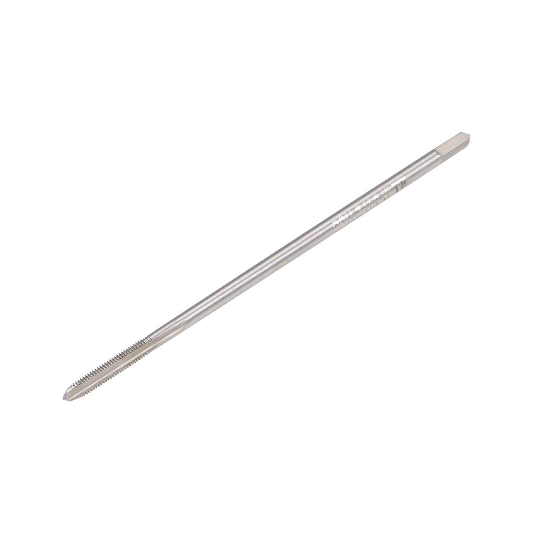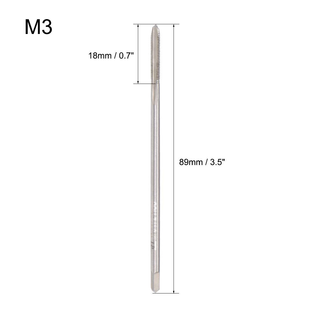 Metric Thread Tap: Thread size: M3 x 0.5 (right hand); accuracy: H2; total length: 89mm / 3.5" (extra long); square shank width: 2.3mm / 0.09"; thread length: 18mm / 0.7"; number of chip flutes: 3 flutes. Micro taps are mainly used in clocks and watches for machining holes in wood and soft metals with low hardness.. Straight Flute Tap: Straight flute design, clear threads without burrs, right hand tapping direction. Provides rapid downward chip removal to achieve efficient thread cutting, suitable for processing through holes or shallow holes.. Wide Applications: Thread taps create new threads or re-thread damaged or jammed threads. Widely used for most metals, iron plate, copper, zinc, alloy steel, abrasive steel, A3 steel, stainless steel. Add proper tapping oil for higher quality threads and more durable taps.. 6542 High Speed Steel Tap: Offer high hardness, good toughness, wear resistance, and excellent cutting performance. Uncoated taps feature just the base substrate without any additional coatings, great for a wide range of applications.. Tips: Machine taps are used with tapping, drilling, automatic or milling machines. Drill the holes with a twist drill bit first, then tap with a thread tap. The tapping angle should be 90 degrees vertical and stable. NOT recommended for hand and electric drill tapping..