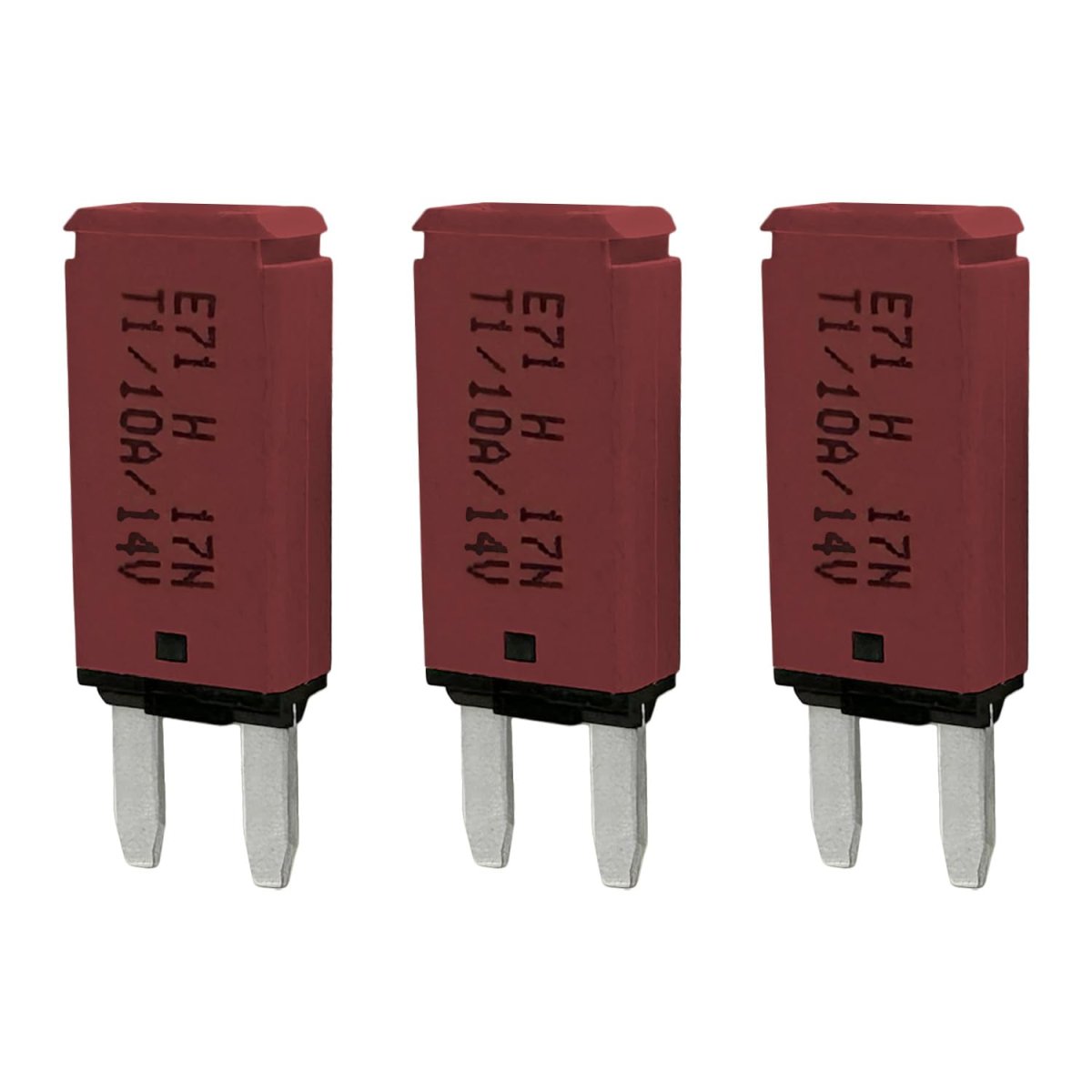 10 Amp - 3 Pack -- Mini ATM Auto Reset (T1) Circuit Breaker. UL-Rated 94V0 thermoplastic body with tin-plated copper alloy terminals. 14V DC - 2.8mm wide blades, compatible with 280 Type fuse blocks. Compliances: SAEJ553 (Ignition Protected) - Automatic recovery functions and overcurrent protection. For use in RVs, Caravans, Boats, Anchors, Trolling Motors, Cars, Trucks and more!.Other fine products
