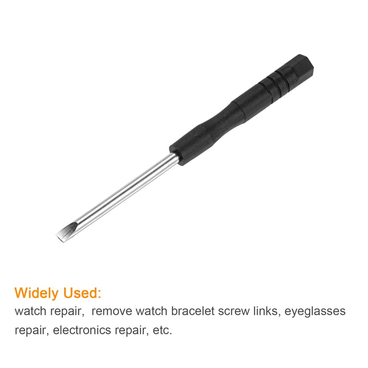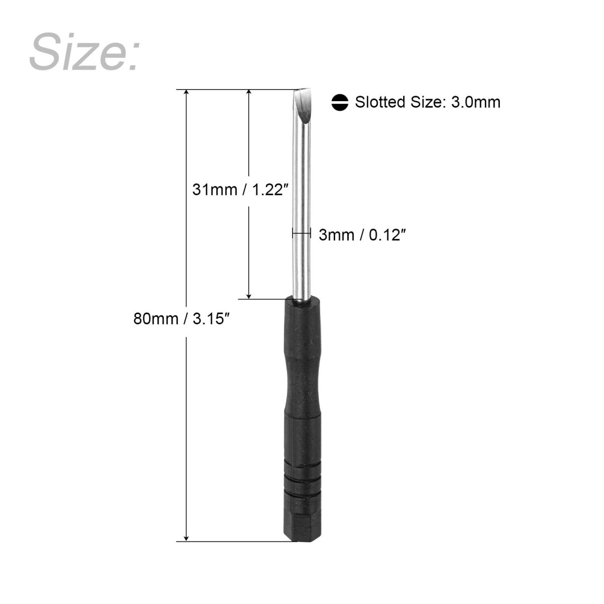Size - 3.0mm flat head, 3.15" (80mm) total length.. Durable - The shaft is nickel plated for corrosion and rust resistance, providing durability and longevity.. Comfortable Grip - Non-slip handle design, moderate size and length, easy and convenient to use.. Easy To Carry - lightweight and compact design, fit in the pocket.. Widely Used - watch repair, watch battery replacement, remove watch bracelet screw links, eyeglasses repair, electronics repair, etc..Other fine products