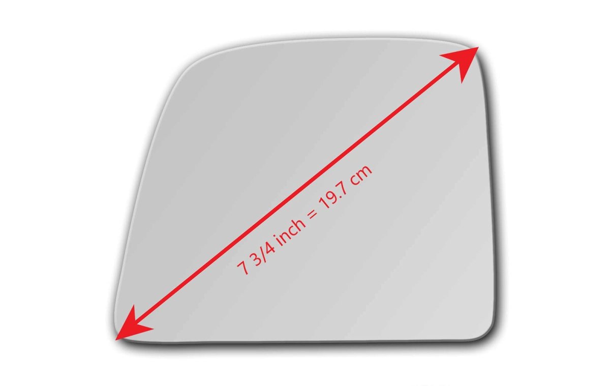 Automotive Grade replacement mirror glass. Actual picture shows mirror glass on top and adhesive at the bottom. No plastic backing plate attached or included.. Diagonal Measure (Longest): 7 3/4 inch = 19.7 cm. Longest diagonal dimension provided is the longest size of the glass in any direction, normally longest top to opposite bottom corners measurement.. Includes double-sided Automotive Grade adhesive contoured to mirror shape that provides optimum heat transfer and easy installation. Beware of small inefficient adhesive patches that fail shortly after installation, and leave air gap between bonding layer. Aluminum back coated real mirror glass for automotive application. Avoid cheap glasses with chrome paint spray film on top that look like mirror but top chrome spray fades or scratches over short time..Other fine products