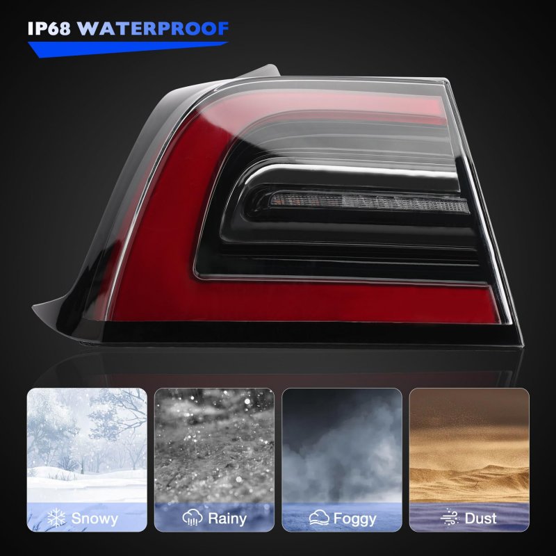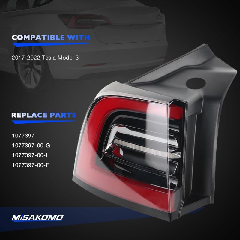 COMPATIBILITYThe tail lights assembly precisely compatible with 2017-2022 tesla model 3 asian and european version. REPLACEMENTPerfectly match and alternate to left driver side taillight assembly 1077397-00-G, 1077397-00-H, 1077397-00-F, 1077397. SAFE DRIVINGThe safe reflectors provide more lights output for wider and smoother beams, with sufficient brightness when driving at night, keeping you and others safe while driving. WATERPROOF & DUST PROOFBuilt in led chips and fully sealed with solid silicone and designed with one-way vents, waterproof and dustproof, safe driving in any bad weather. IMPACT-RESISTANT & TOUGHThe durable polycarbonate Lens provide excellent protection from road debris abuse and the impact of branches on the trail. The ABS+PC sealed shell shell can better withstands the shock and vibration of off-road adventures. PLUG AND PLAYDirect bolt on replacement the original tailllamp and Insert the wire harness into the car light jack, without modifications required and any complicated wiring. STRICT QUALITYTested & certified to meet or exceed OE quality standards and performance. All parts are strictly tested and quality controlled prior to shipment to ensure reliability and long product life.Other fine products