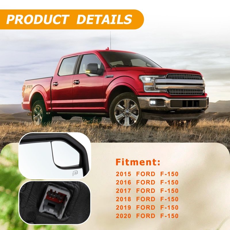Passenger Right Side Mirror compatible with Ford F150 2015 2016 2017 2018 2019 2020. Features Introduction : 1. Electrically adjustable rearview mirror 2. with Turn Signal Light & Power Heated 3. without Temp Senso & power folding. Aerodynamic shape and tight fit help prevent vibration and wind noise. Direct replacement, matching with factory parts.Other fine products