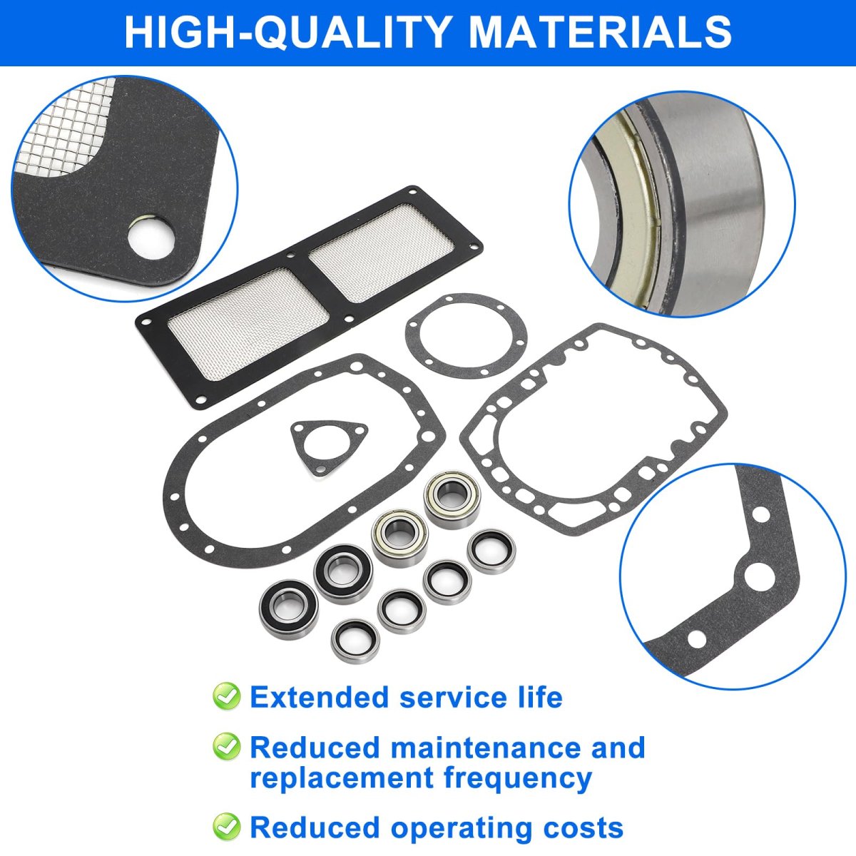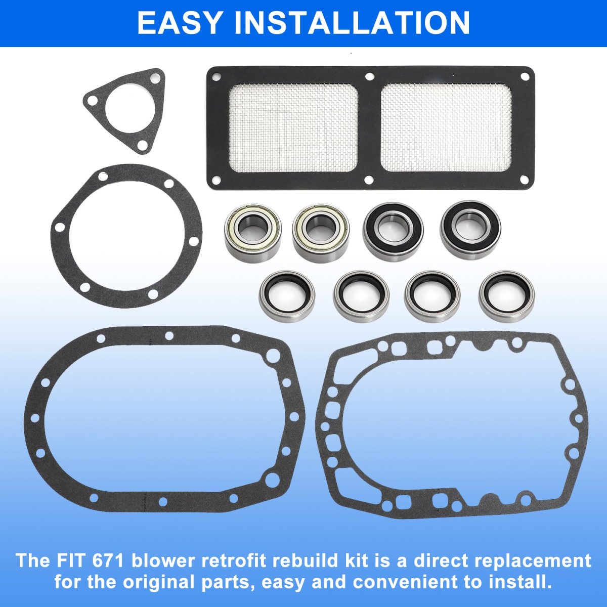 Functionality: This Blower Conversion Rebuild Kit is designed to convert a 6-71 diesel to a gasoline supercharger.. High-quality Materials: The kit is made of high-quality materials to ensure a longer service life for the converted blower. Reduced maintenance and replacement frequency reduces operating costs.. Fitment: For high-performance automobiles and rat rods, and for gasoline engines that need to be retrofitted with a 6-71 blower.. Easy Installation: The FIT 671 blower retrofit rebuild kit is a direct replacement for the original parts, easy and convenient to install.. Package Includes: 1x Screen Gasket, 1x Gear Cover Gasket, 1x Snout Gasket, 1x Tri-plate Gasket, 1x Cover Gasket, 2x High Speed Double Row Bearings, 2x Single Row Sealed Bball Bearings, 4x Double Lip Reinforced Seals.