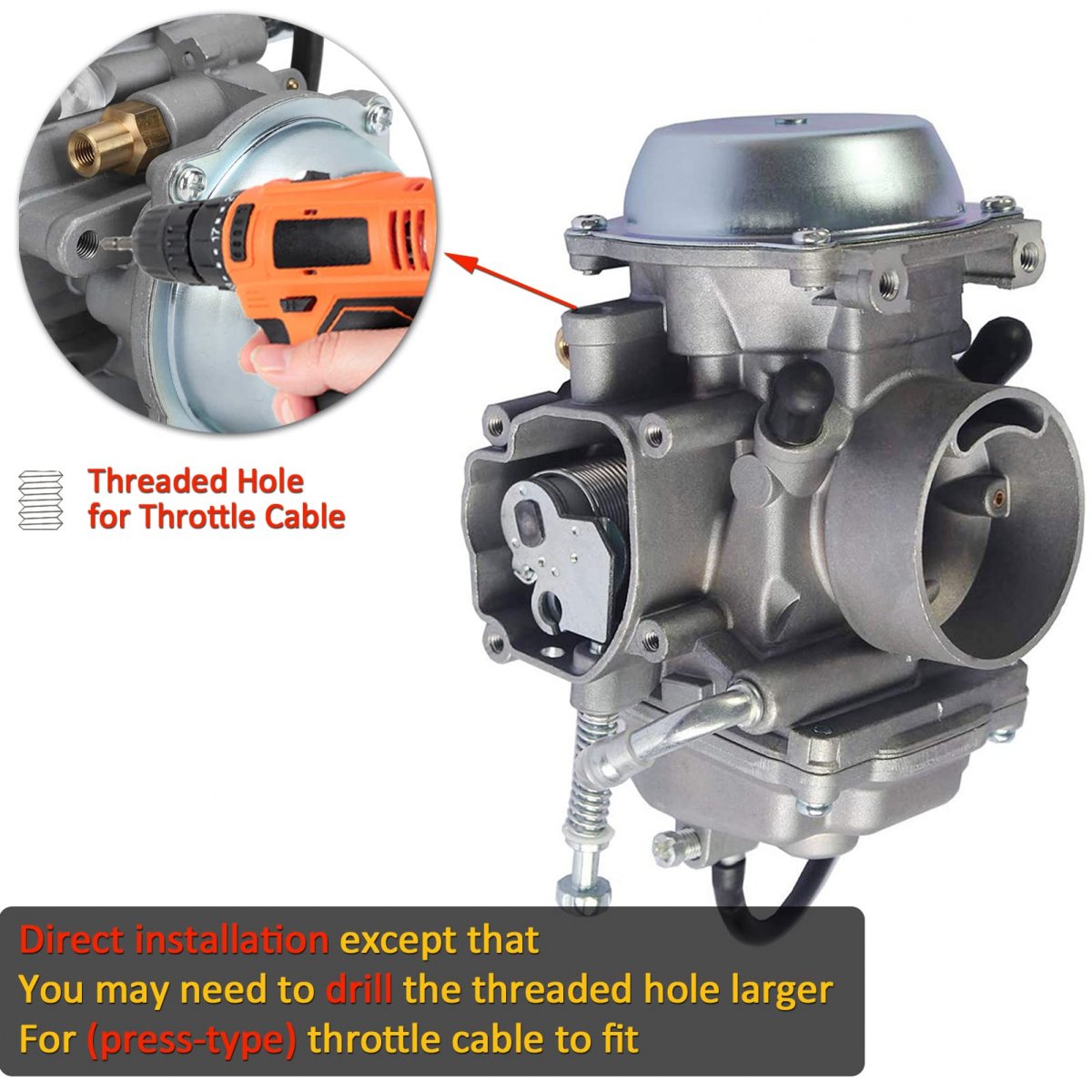 For Polaris Sportsman: 300 (08-10), 335 (99-00), 450 (06-07), 600 (03-05), 700 (02-06).. For Polaris Sportsman: 400 (01-05), 400 HO 4X4 (12-14), 400 HO 4X4 SE (2014).. For Polaris Sportsman: 500 (96-98), 500 4X4 NON-HO (99-04), 500 6X6 (00-08).. Main jet 180, pilot jet 42; Manifold outlet O.D. 40.8mm, filter outlet O.D. 50.8mm, choke cable hole 10mm, choke cable total length 90cm.. Preset, direct installation with no or small modification: you may need to drill the (threaded) hole larger for (press-type) throttle cable to fit..Other fine products