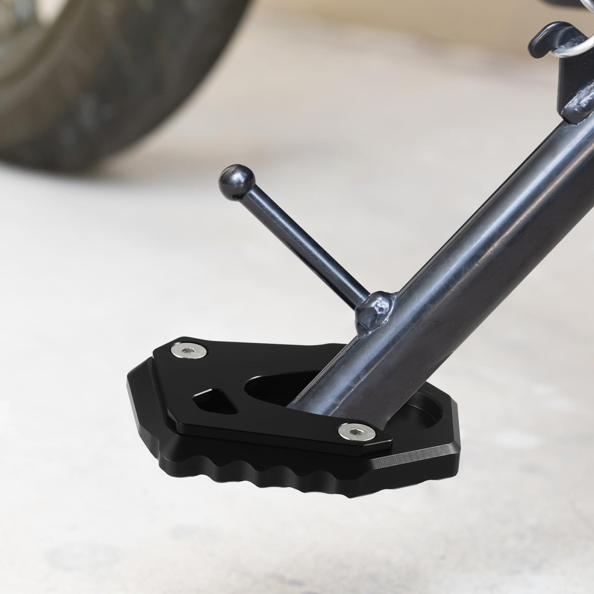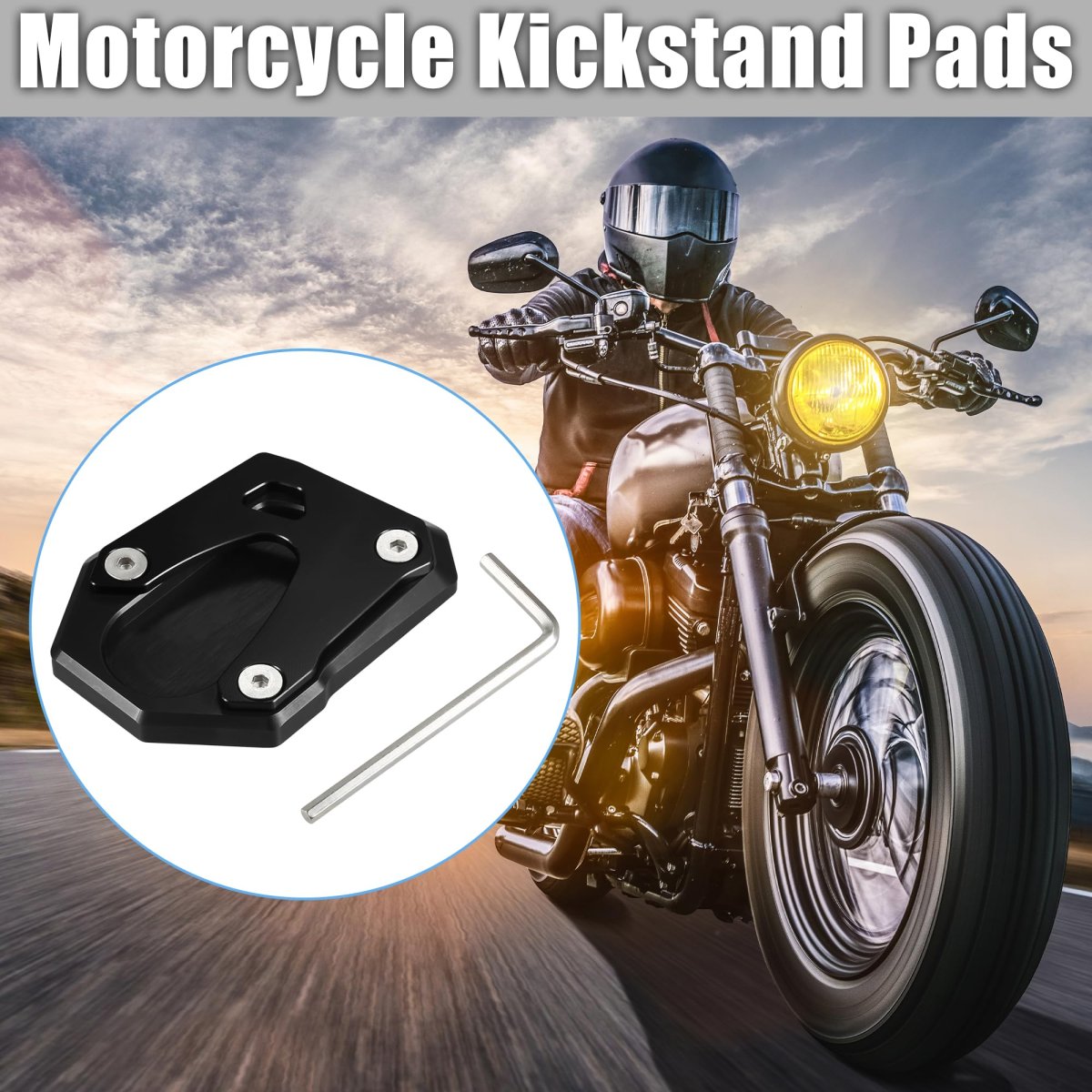 Material: It is challenging to fade items with a laser alloying surface finish. Anti-corrosion and anti-rust properties ensure long-lasting durability and a positive product experience for you.. Effects: When parking your motorcycle, extend your kickstand and rest it on the footrest. It lessens scuffing on garage flooring and assists you in preventing motorcycle side stand scratches.. Anti-Slip: A wider area of support for the side stands can more evenly distribute the weight of the motorcycle, improve the kickstand's surface area, avoid slippage, and help riders manage and stable the body of the vehicle.. Packing Include: 1 x Motorcycle Kickstand Pads, 1 x Wrench..Other fine products