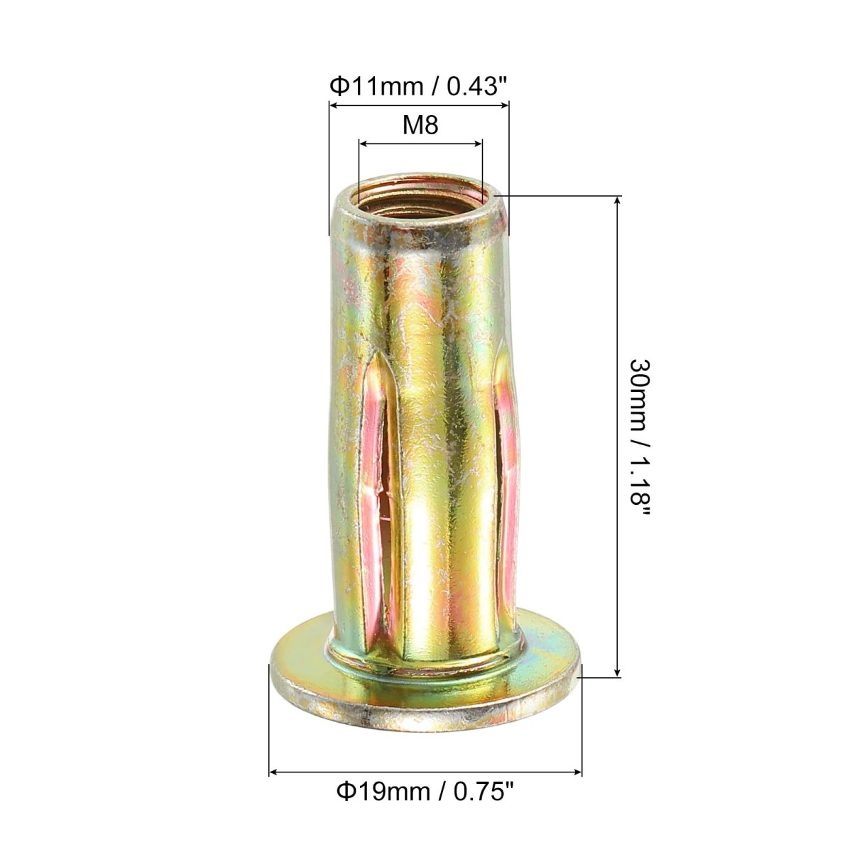 Material: Carbon Steel; Thread Size: M8x1.25mm; Drill hole size: 11mm/0.43"; Fastener Type: Hollow. Mechanical internal thread, materials, uniform wall thickness, surface treatment, corrosion resistance, and high strength.. Drill a hole according to the size of the rivet nut installation hole, insert the rivet nut, and tighten the locking nut with the rivet tool.. Widely used in sheet metal, household thin iron cabinet, roof, equipment casing, etc.. Widely used in metal sheets or non-metal plastic, wood, and other sheets, rivet nuts can be firmly fixed on the sheet to provide tight thread locking force..Other fine products