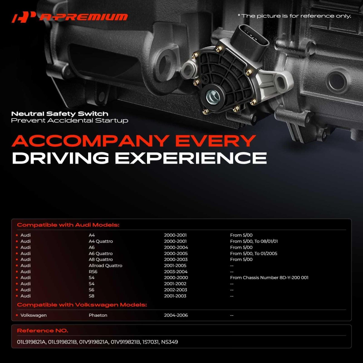 [Vehicle Fitment]: Compatible with Audi A4 2000-2001 (From 5/00), A4 Quattro 2000-2001 (From 5/00, To 08/01/01), A6 2000-2004 (From 5/00), A6 Quattro 2000-2005 (From 5/00, To 01/2005), A8 Quattro 2000-2003 (From 5/00), Allroad Quattro 2001-2005, RS6 2003-2004, S4 2000 (From Chassis No. 8D-Y-200 001), S4 2001-2002, S6 2002-2003, S8 2001-2003; Compatible with Volkswagen Phaeton 2004-2006. [Specification]: Attachment Method: Bolt Mount; Connector Gender: Female; Connector Shape: Oval; Gaskets Included: No; Voltage: 12V. [Benefits]: The A-Premium neutral safety switches are built with premium materials and strict manufacturing standards for delivering exceptional performance and long-lasting reliability, preventing unintended vehicle rolling after gear engagement and enhancing driving safety.Other fine products