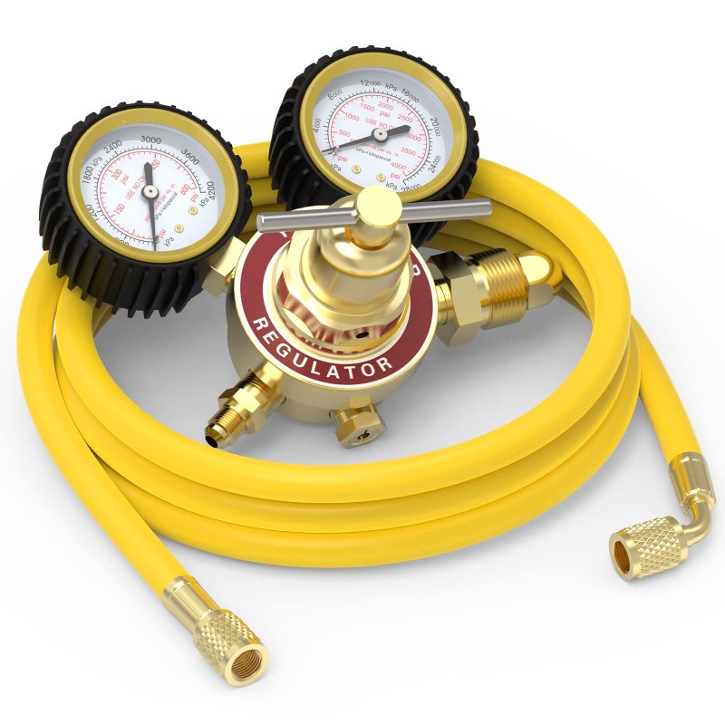 Application: nitrogen regulator is great for HVAC purging, inertization, pressure tests, leakage tests, brazing, soldering and etc.. Connections: CGA580 inlet connection and 1/4" male flare fitting. Air Pressure: low pressure gauge: 0-600 PSI; high pressure gauge: 0-4000 PSI. The display shows 600PSI and you can rate them at 450PSI, but they are able to go up to 600PSI.. Structure: brass material, T-shaped adjustment handle for easy manual adjustment. Package Includes: nitrogen regulator, 6.56 feet hose.Other fine products