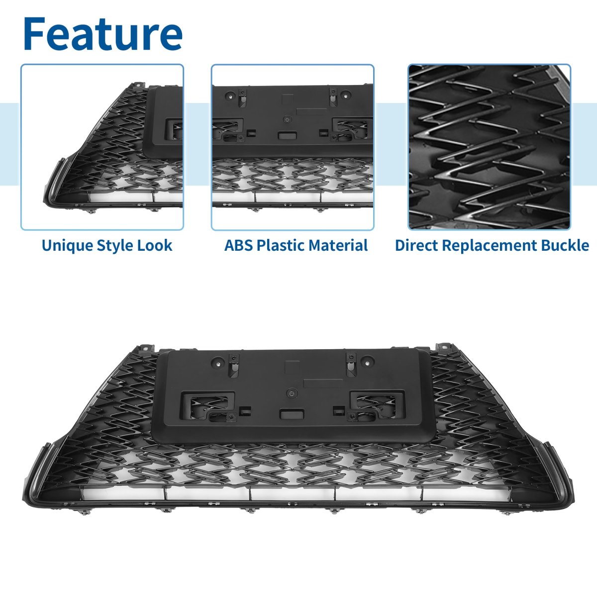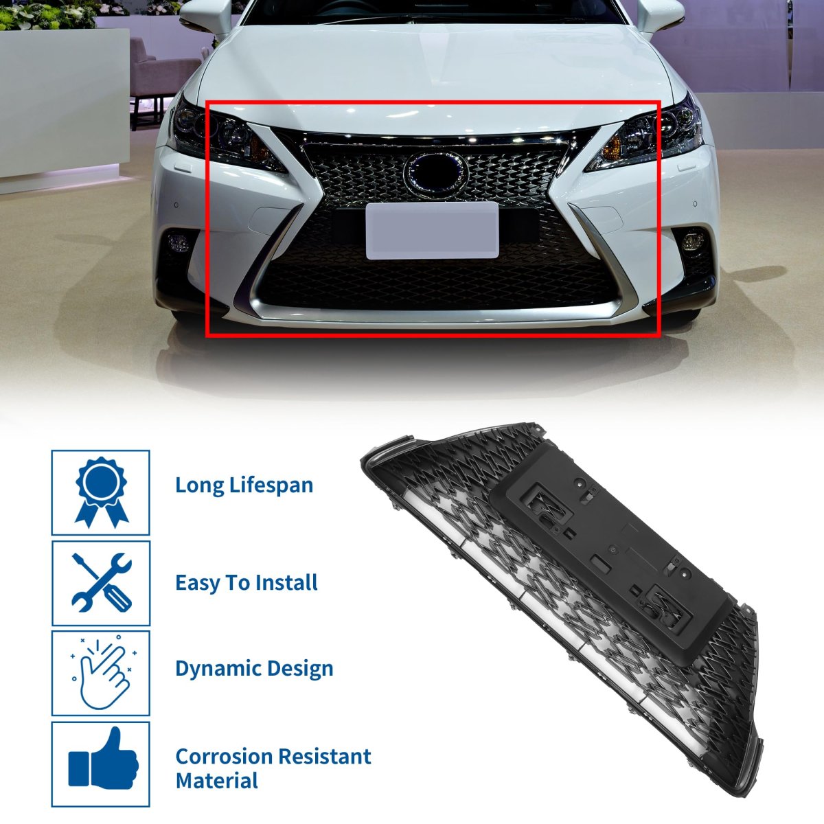 Fitment: The front hood bumper grille is fit for Lexus CT200h 2017. OE Number:5310276100. Features: Front hood grille grill can directly replace old or worn car grilles. Improving your car grade, upgrade your vehicle's exterior styling for a luxurious look that will make your car unique.. Advantage: The front bumper grille grill is made in Durable ABS plastic which makes it light and stable. Overall durable construction can withstand heat generated by engine and sun exposure. This material is resistant to corrosion, fading, and impact, ensuring your grille will look great for years to come.. Function: The gap after installation is small. The hood bumper grill provides better airflow to the radiator to help the cooling process better. Will not affect the shutters behind the car grille..Other fine products