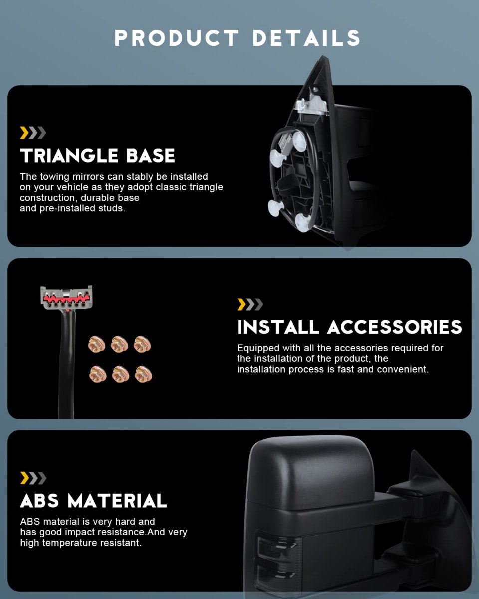 Fitment - 2003-2007 for F250/for F350/for F450/for F550 Super Duty 2003 2004 2005 for Excursion. Features - 1.ADJUSTMENT-This is a POWER MIRRORS, so you can adjust the angle of the mirror with the button inside your vehicle. It only applies to vehicle that already have power mirror feature.2.HEATED-Heated mirrors cleans frost and ice, making it possible to see clearly even in extreme weather.3.TURN SIGNAL- Amber arrow light in the lower mirror will turn on when turn signal is activated, ensure others could Notice so that could reduce the risk of crashing.. Manufactured Standards - Manufactured according to Factory OE Standards./Size same as OE parts/specification material same as OE/installation without modification.. Upgraded - The mirrors provide better and wider angle of rear view, which can improves visibility and reduces blind spot, also it can dramatically improve styling and appearance..Other fine products