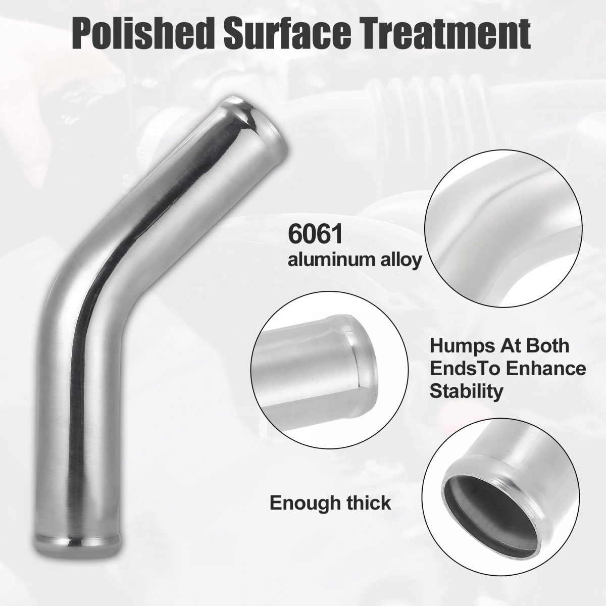 Specification: Type: 45 Degree. Outer Diameter: 51mm / 2.01"(D). Leg Length: 150mm/0.49 feet. Total Length: 300mm/1 feet. Wall Thickness: 2.5mm / 0.10"(T), 12 Gauge.. Good surface treatment: Designed for cutting, splicing, or welding to suit custom applications.. Universal: Fit for air intake, cooling systems, turbo intercooler piping setup.. Quality Material: Made of good 6061 aluminum alloy material. It is suitable for a wide range of custom applications while being able to withstand high temperatures and pressures.. Humps at both ends to enhance stability, convenient for clamp installation. The mandrel bent aluminum alloy tubing keeps air flow uniform, smooth, and free flowing..Other fine products