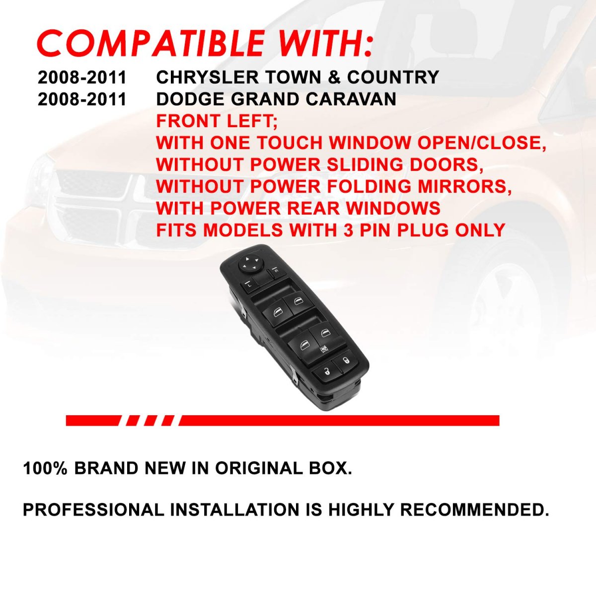 Compatible with 08-11 Chrysler Town& Country, 08-11 Dodge Grand Caravanwithout Power Sliding Doors. Matte Black Power Window Switch, Features a Factory Style Finish to Match the Dash of Your Vehicle and Provide Factory-Fresh Appearance. Made with Durable and Sturdy ABS Plastic to Provide Long Operating Life and Excellent Performance. High Impact Strength, Chemical Stability, Good Electrical Performance, Can Keep Your Vehicle in Good Condition. Comes with 1 X Power Window Switch w/ Power Mirrors, w/o Power Rear Windows. Plug and Play Style, Proper Fitting and Function. Direct Replacement for Your Factory Switch, Installation Only Takes a Matter of Minutes.Other fine products