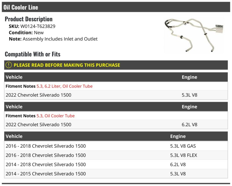 • Oil Cooler Line Inlet And Outlet For 2014-2018 2022 Chevy Silverado 1500